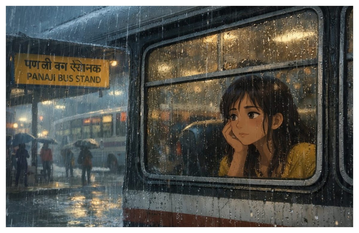 खाली “बिचोले बिचोले, म्हापसा, थिये, अस्नोडा, बिचोले” ची तीव्रता आता वाढायला लागलेली. बस भरत चाललेली. वेगवेगळ्या माणसांनी, त्यांच्या वेगवेगळ्या तऱ्हांनी, बोलण्यांनी आणि वेगवेगळ्या वासांनी… एवढ्यात एकाएकी पाऊस सुरू झाला. पटापट सर्वांनी खिडक्या लावून घेतल्या. तिच्यावर पावसाचे चांगलेच शिडकावे आले म्हणून तिनेही खिडकी लावून घ्यायचा प्रयत्न केला. घट्ट झालेली खिडकी एक सेंटीमीटर जी हलली ती कितीही जोर लावला तरी पुढे जाऊन बंद होईना. तेवढ्यात सीटजवळ उभ्या असलेल्या एका तरुणाने आपल्या अस्तन्या वर सारून हातानेच तिला थांब म्हणून खूण केली आणि खिडकीची काच पुढे ढकलू लागला. खिडकी एकदाची बंद झाली. तिने डोकं झुकवून त्याला न बोलताच खुणेने धन्यवाद म्हटलं आणि एक स्मितही दिलं. चेरी ऑन टॉप म्हणून!